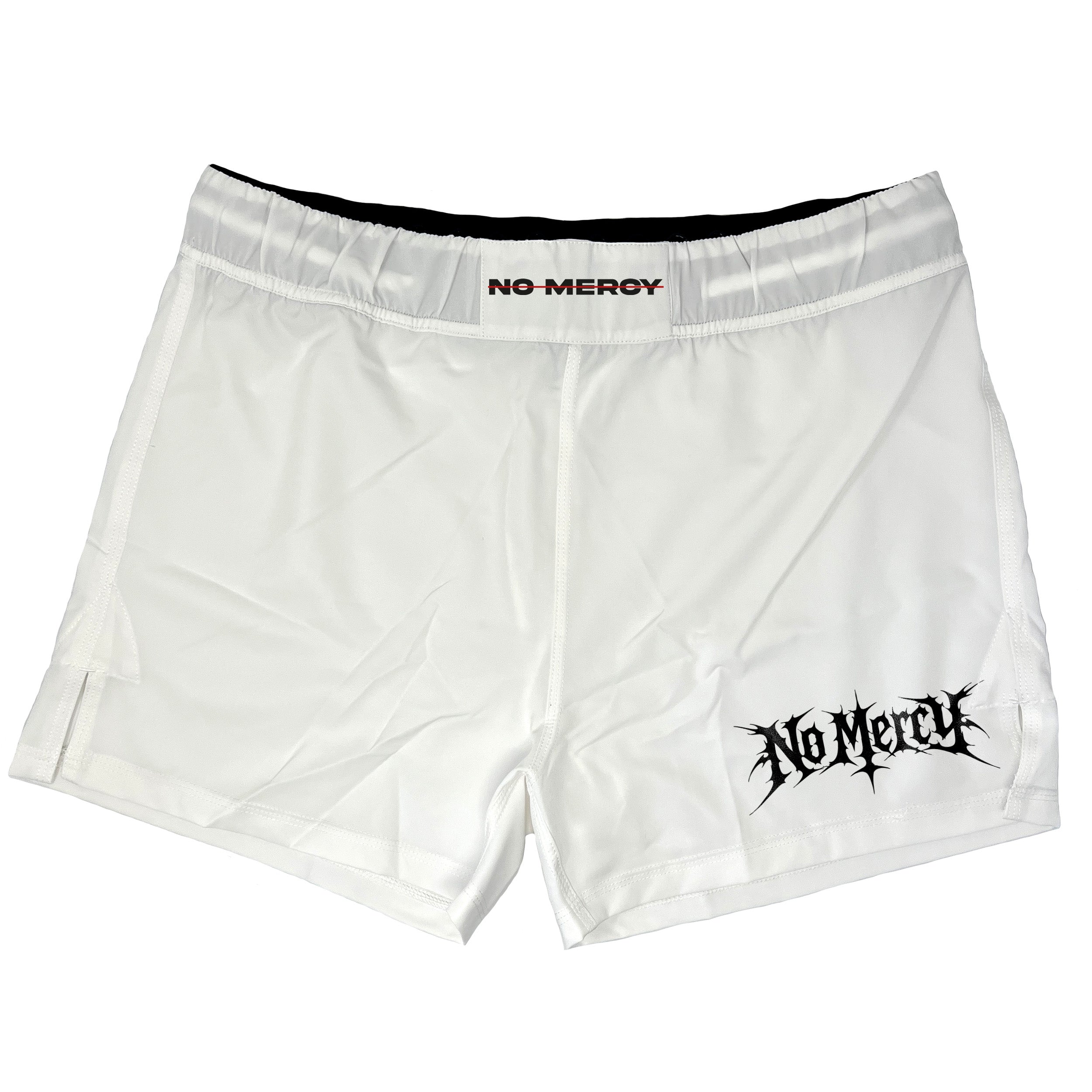 Constructed from lightweight, high-performance fabric, these shorts are designed to move with you through every scramble, guard pass, and takedown attempt. The clean white base delivers a sharp, stripped-back aesthetic, while the aggressive No Mercy logo on the leg carries the brand’s raw, uncompromising attitude.