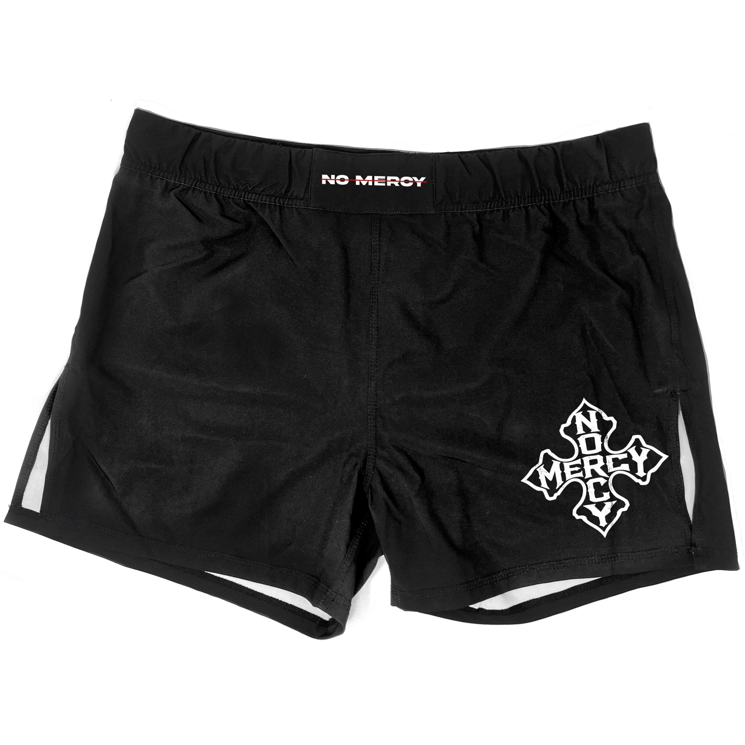 Crafted from lightweight, high-performance fabric, they’re designed to handle the chaos of grappling without slowing you down. The sleek black base gives them a clean, modern look, while the bold Iron Cross-style No Mercy emblem on the leg stands as a mark of toughness — a reminder that the strongest fighters are forged through pressure.