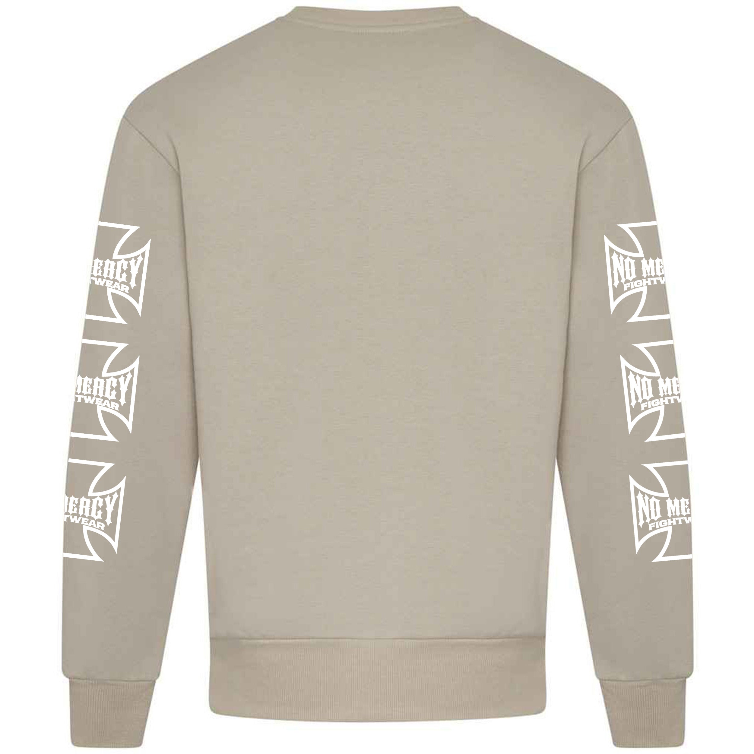 Cut in black, this piece carries bold No Mercy Iron Cross graphics in burnt orange, giving it a sharp contrast that feels both vintage and aggressive. The chest features the central No Mercy Fightwear Iron Cross logo, while the sleeves carry repeated cross graphics down the arms — creating a strong, unmistakable No Mercy identity from every angle.