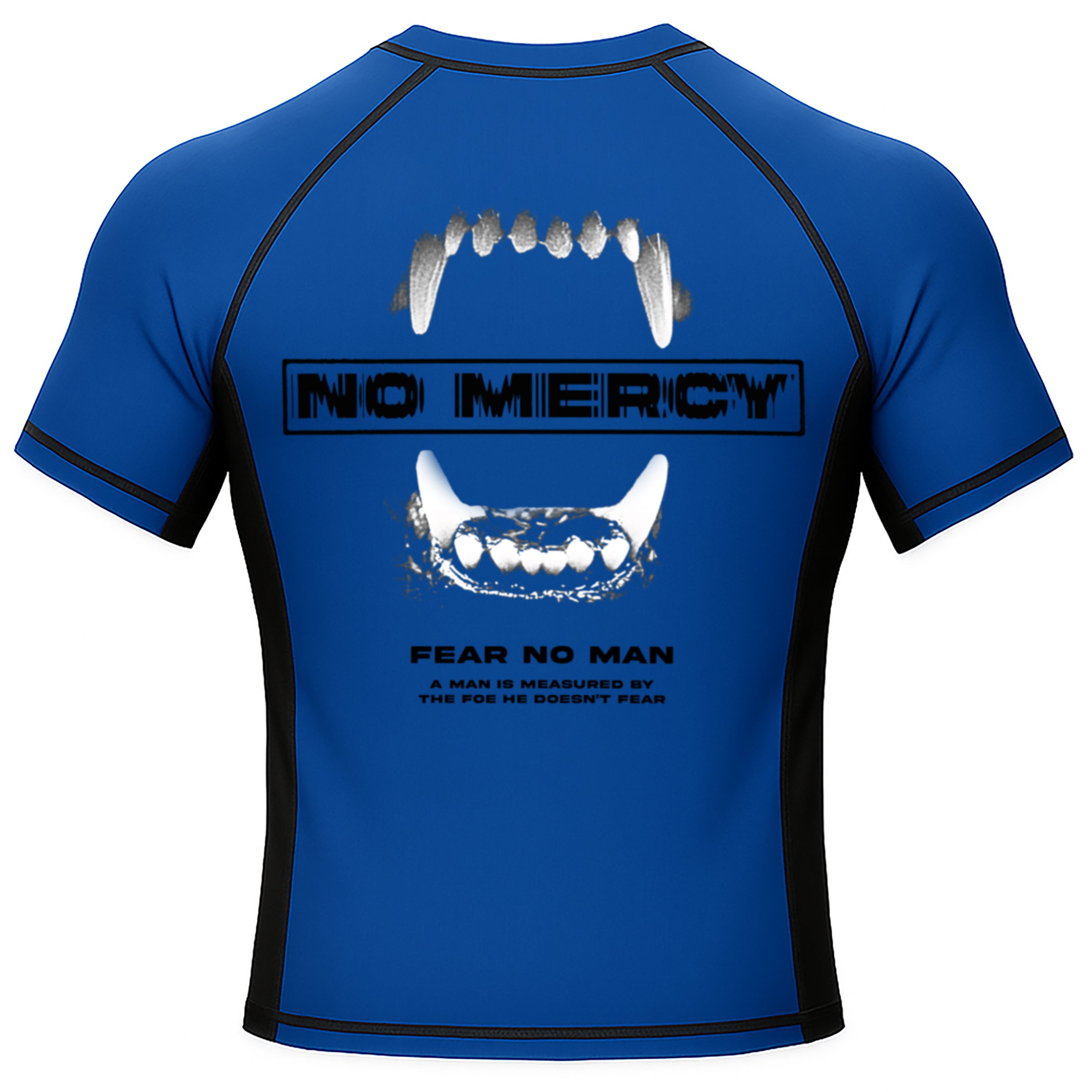 Step onto the mats with unshakable intent. The No Mercy Bite Back Rash Guard embodies grit, aggression, and the refusal to bow under pressure. On the back, a bold “No Mercy” is locked between a set of savage animal teeth, anchored by the statement: “Fear No Man. A man is measured by the foe he doesn’t fear.” It’s a reminder that true strength is tested only under fire.