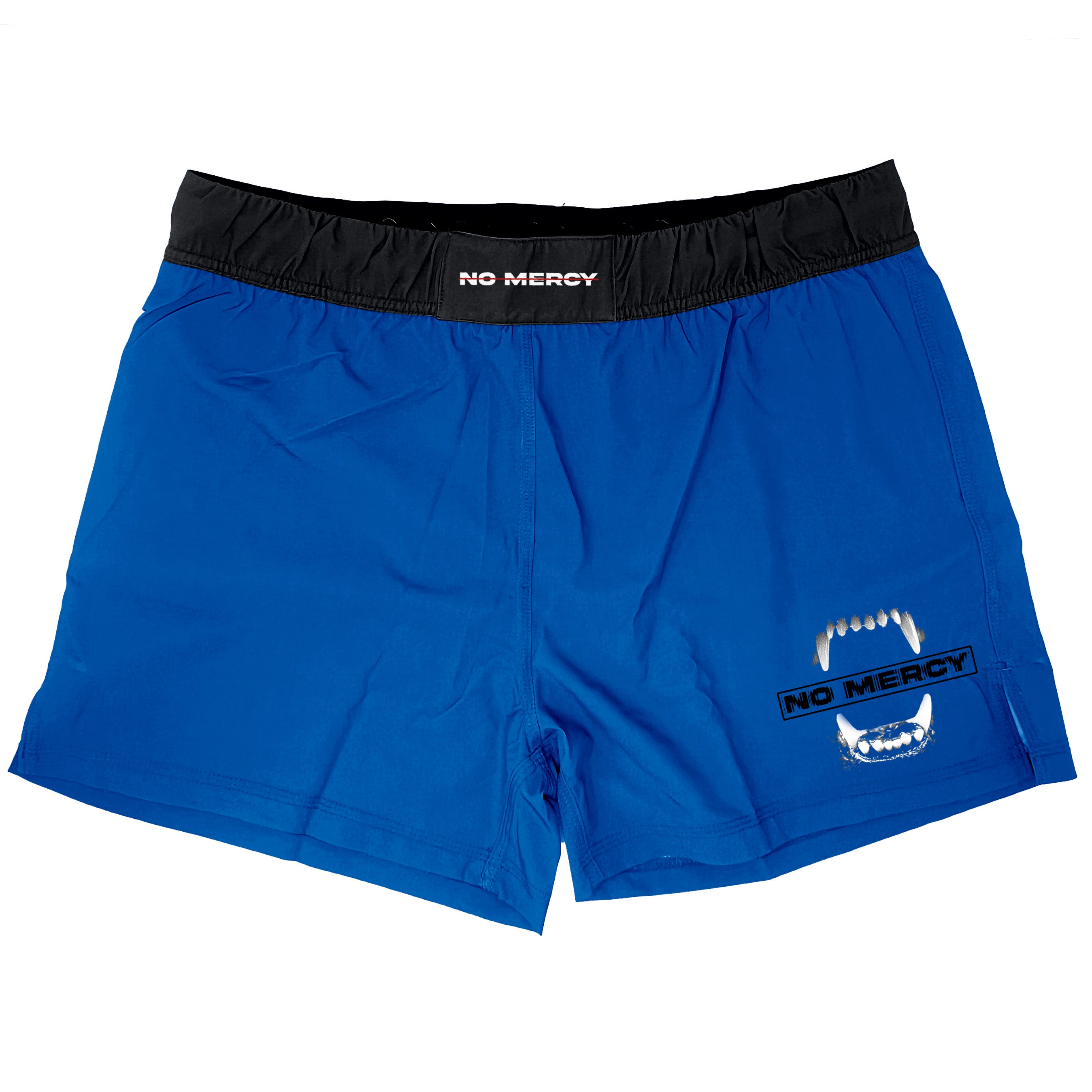 The black waistband is stamped with the No Mercy logo front and centre, sealing the look with purpose. Finished in IBJJF-approved blue with black detailing, these shorts bring a clean but savage edge to the mats — whether in training or under the lights of competition.