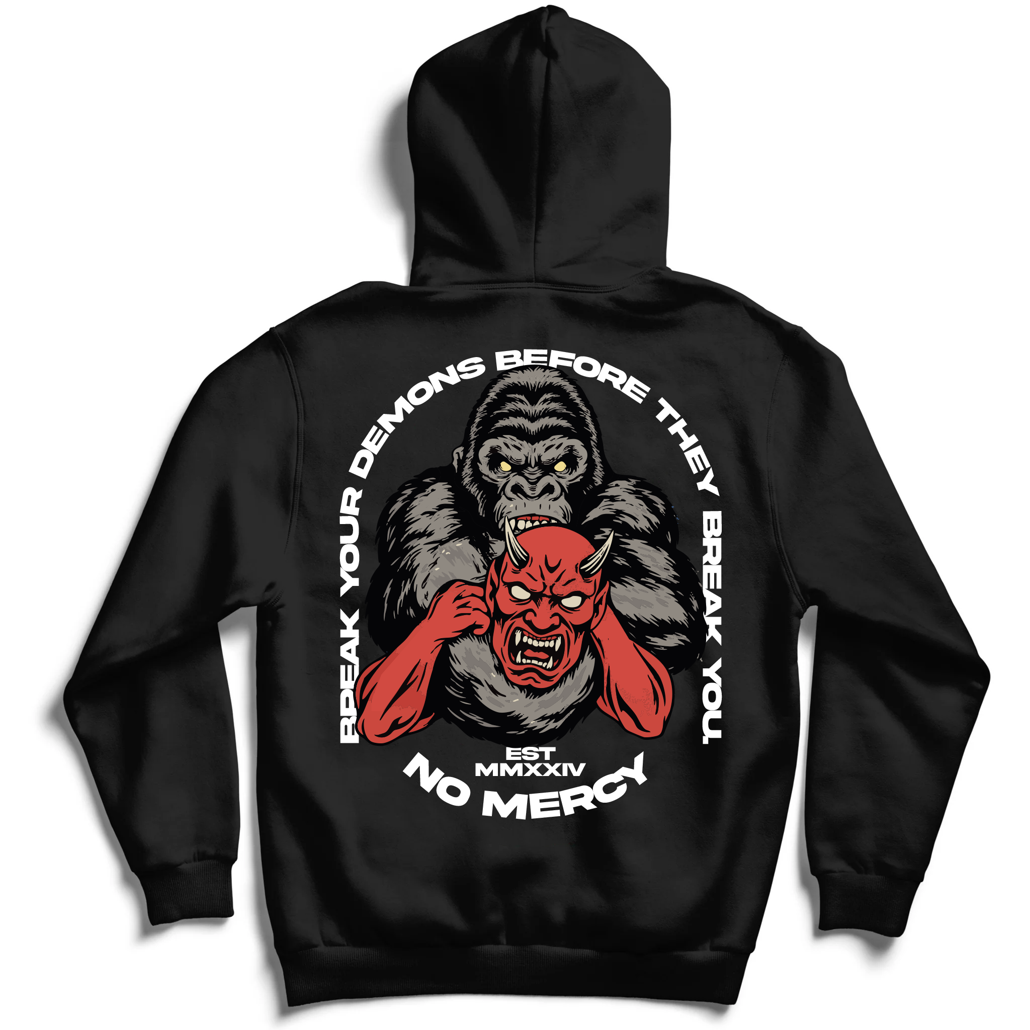 On the back, a striking graphic shows a gorilla holding the devil in a choke hold — a raw symbol of strength, domination, and the battle against your inner demons. Surrounding it, the words “Break Your Demons Before They Break You”serve as a relentless reminder: conquer your battles or be consumed by them.