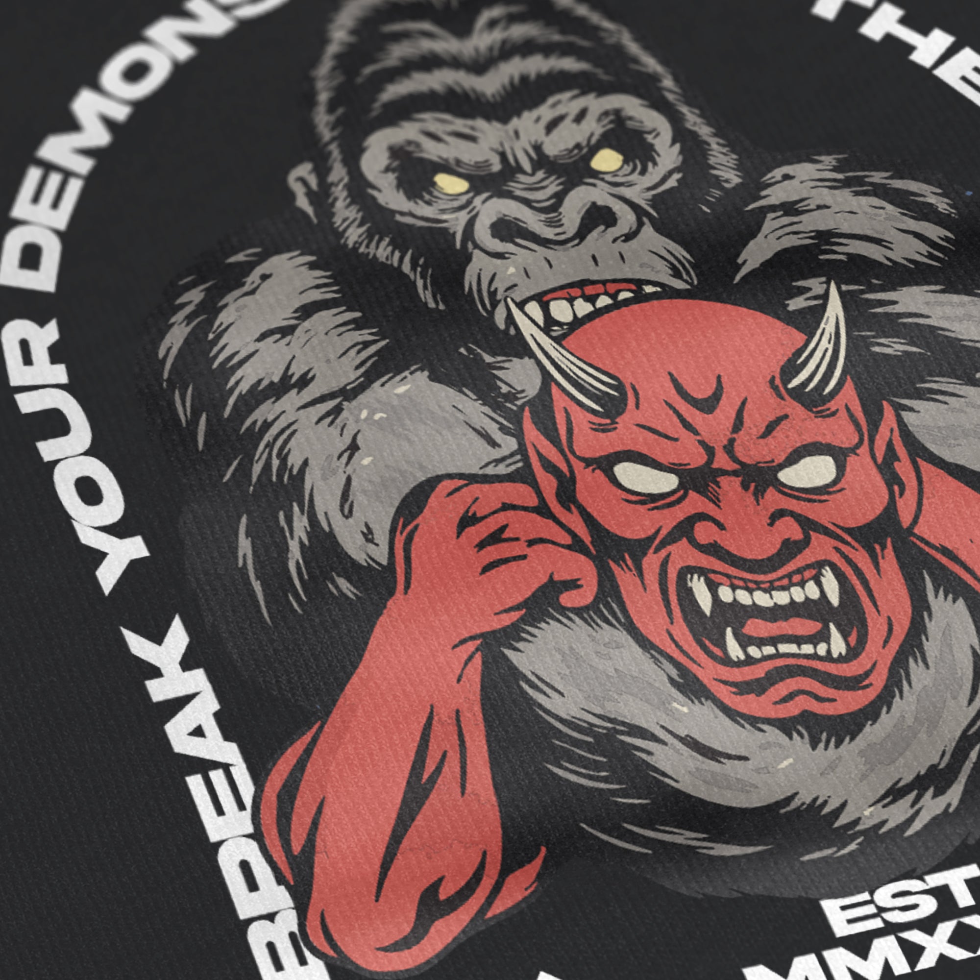 • Back Graphic: Gorilla vs. Devil Choke Hold + “Break Your Demons Before They Break You”
