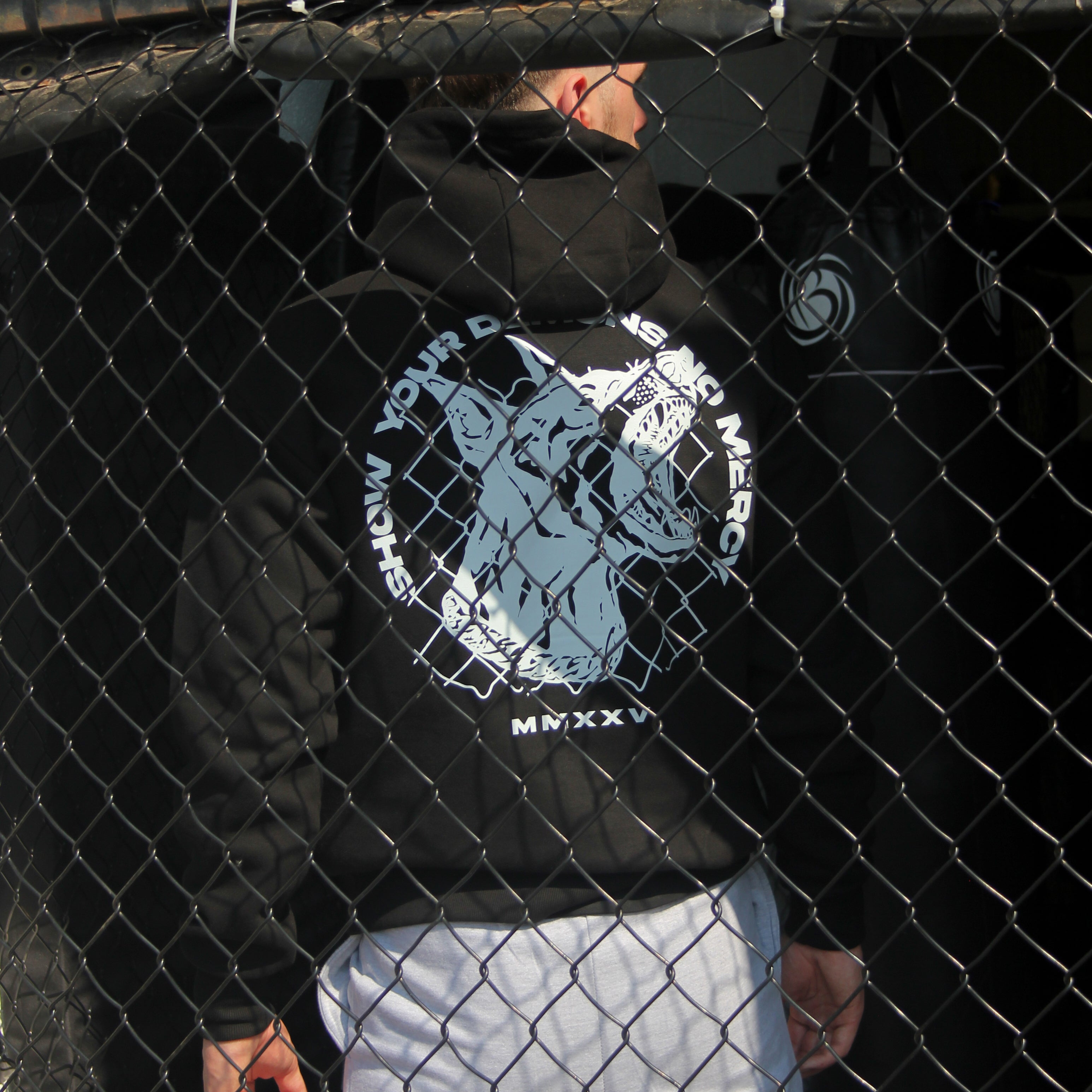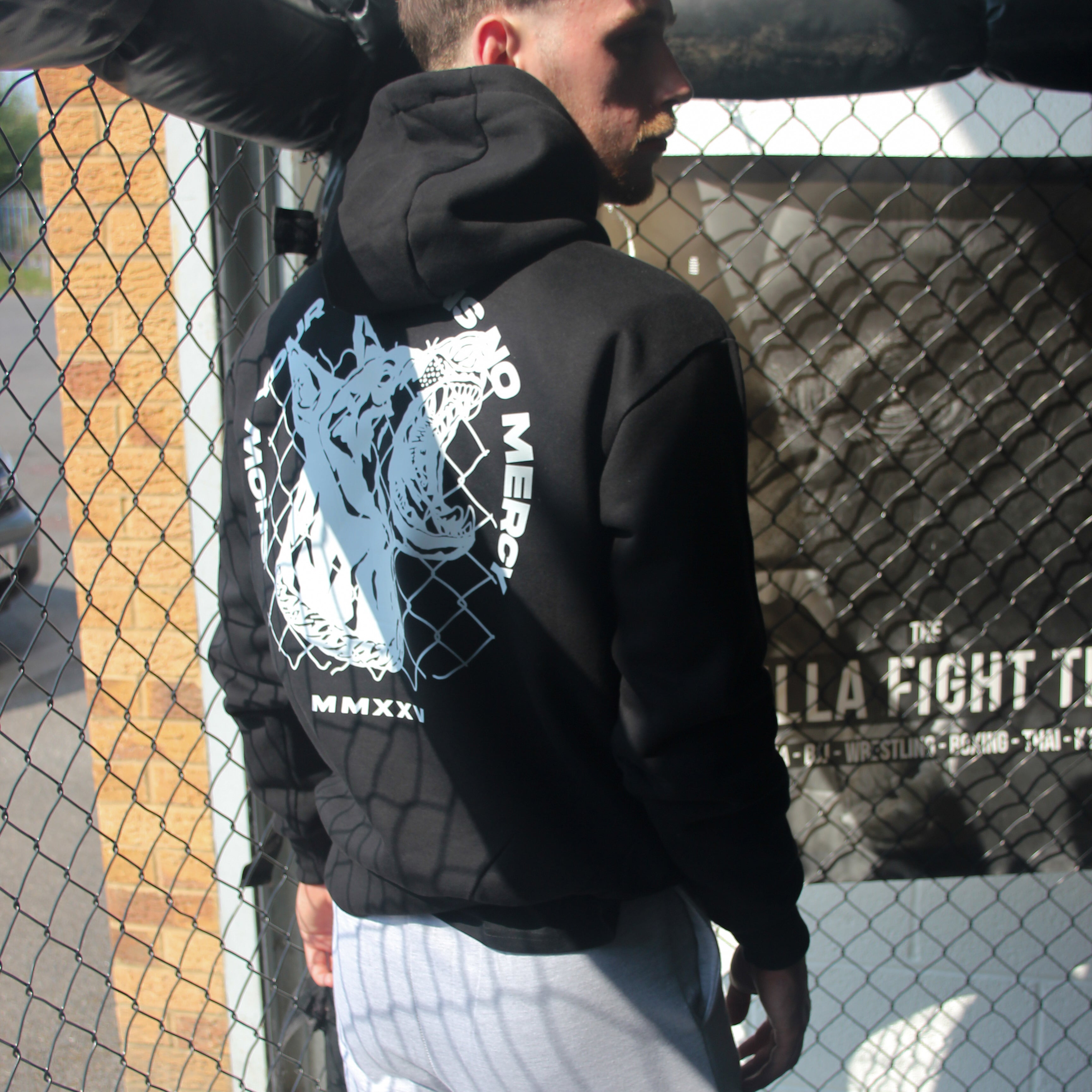 Introducing the No Mercy Hoodie in Black, designed for those who confront their inner battles and show no mercy. Crafted from premium heavyweight cotton, this hoodie offers a relaxed fit with ribbed hem and cuffs for added comfort and durability. The back features a powerful caged dog barking graphic, symbolising the raw power and determination to overcome your demons. The bold “Show Your Demons No Mercy” message reminds you to face every challenge head-on. The front is graced with the “No Mercy” logo, representing the relentless mindset that drives you to never back down. With two hand pockets for practicality, this hoodie combines fierce style with function for warriors who train with heart and soul.