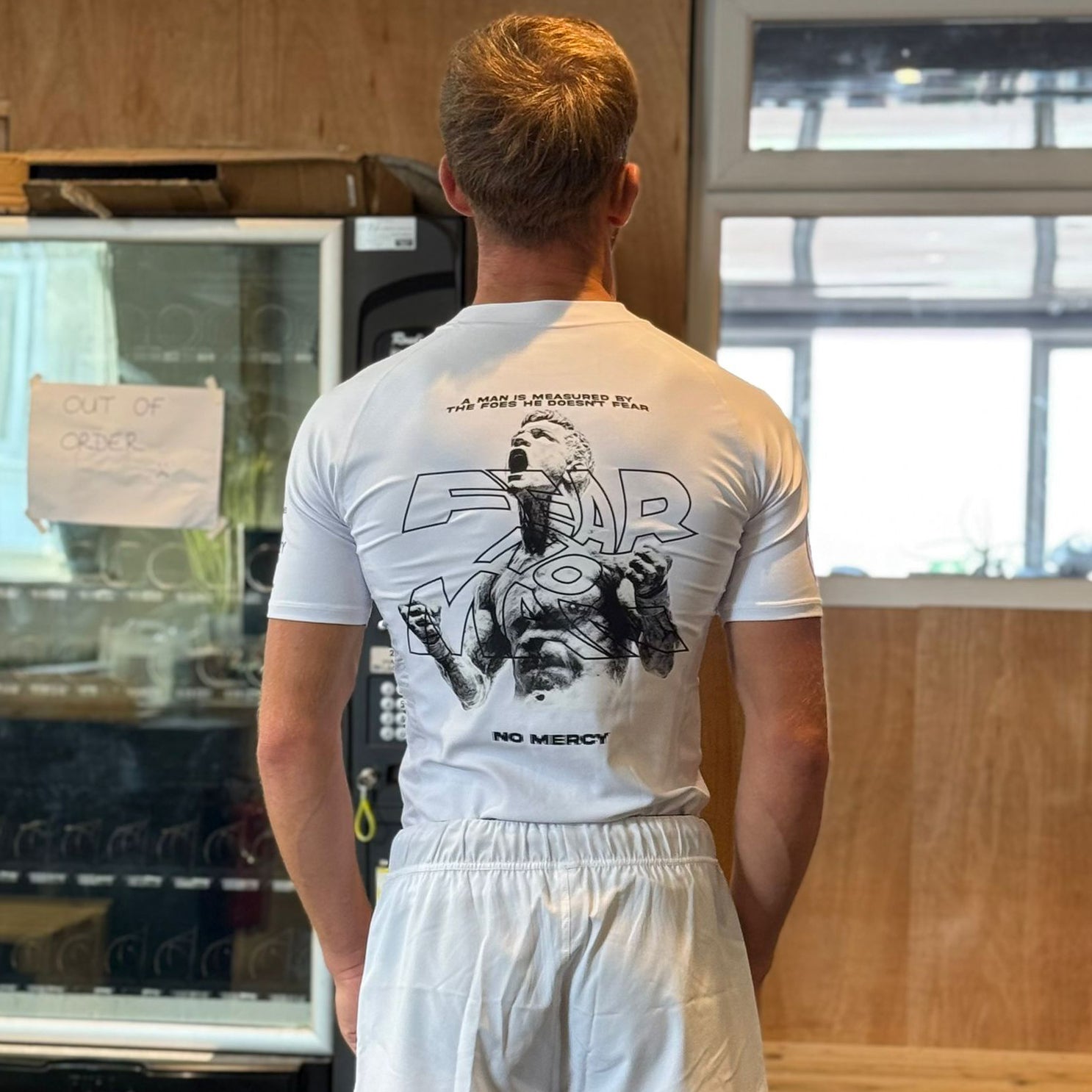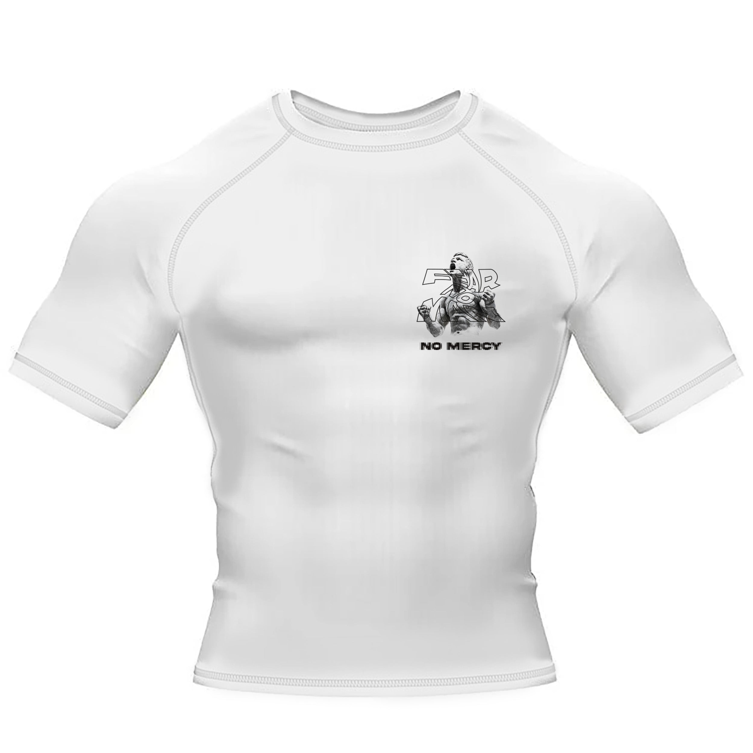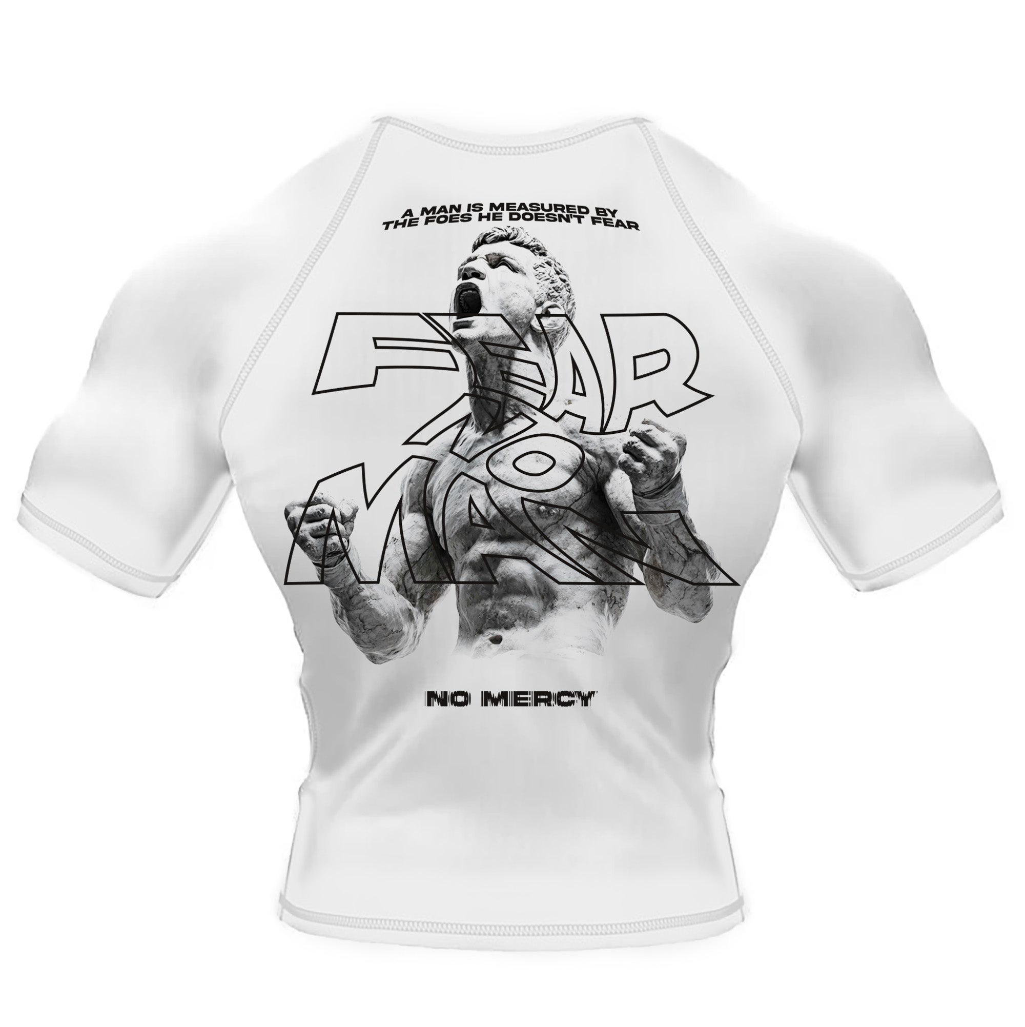 At the core of the design, a striking illustration of a man shouting in victory embodies the spirit of triumph under pressure. Below it, the bold “Fear No Man” statement and the No Mercy logo seal the rash guard with unrelenting intent. The clean white base makes the artwork stand out, delivering a fearless presence on and off the mats.