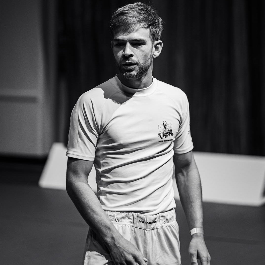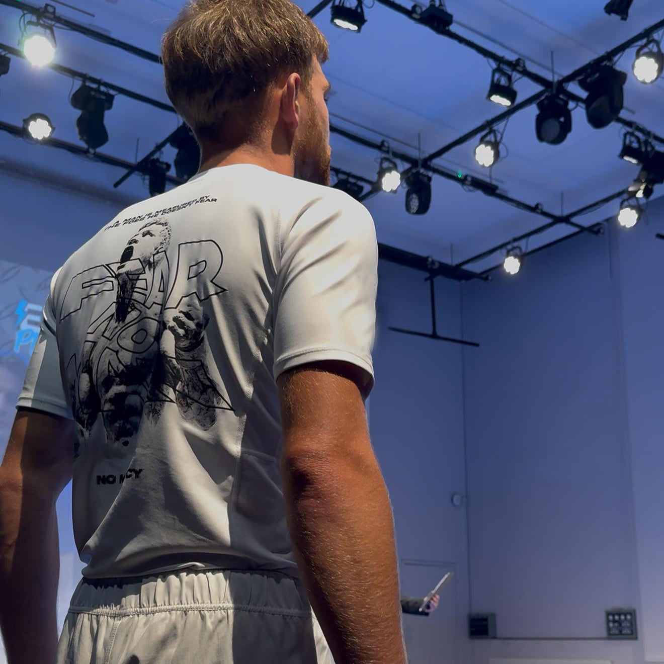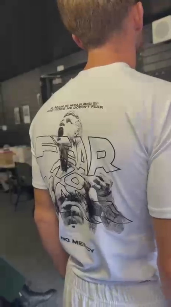 At the core of the design, a striking illustration of a man shouting in victory embodies the spirit of triumph under pressure. Below it, the bold “Fear No Man” statement and the No Mercy logo seal the rash guard with unrelenting intent. The clean white base makes the artwork stand out, delivering a fearless presence on and off the mats.