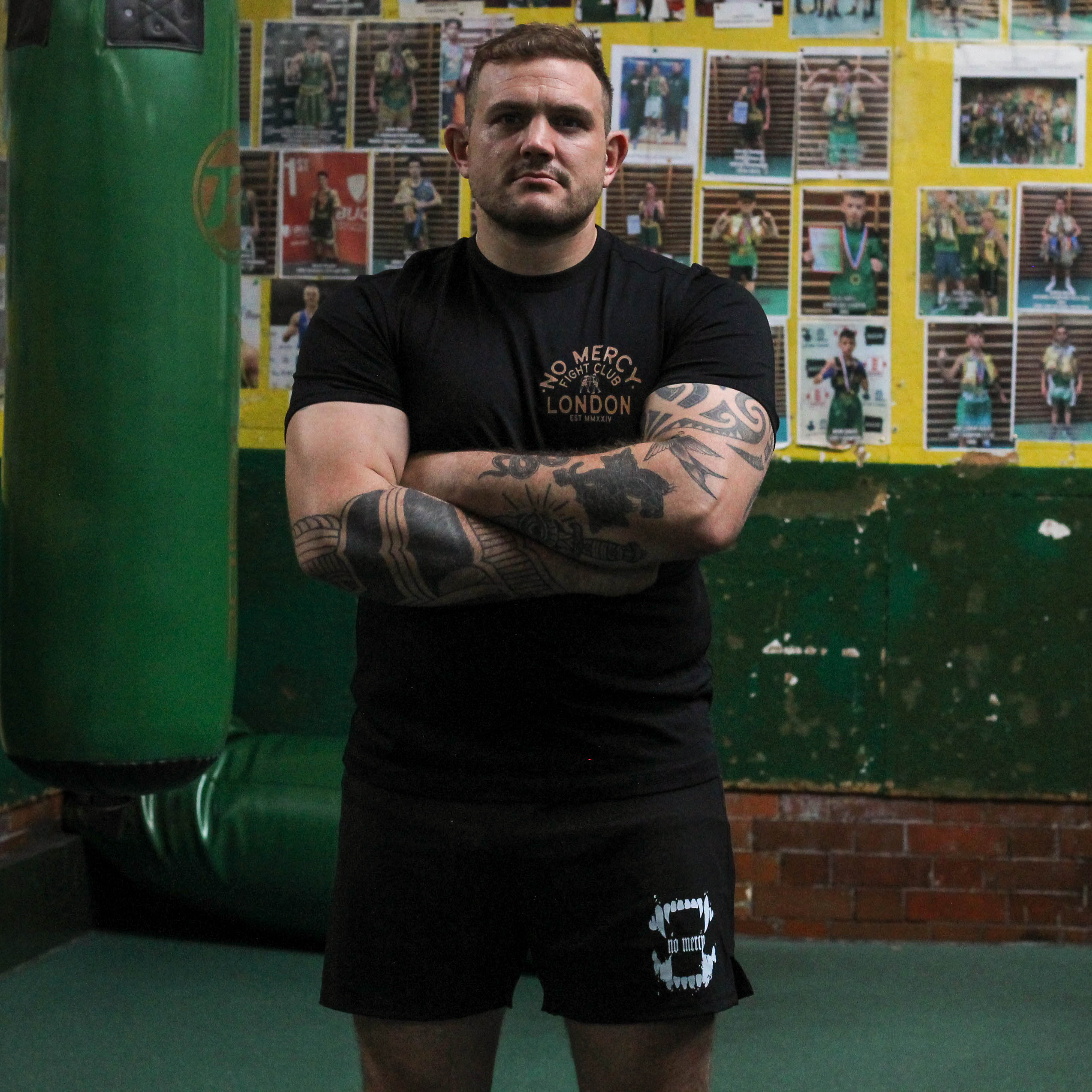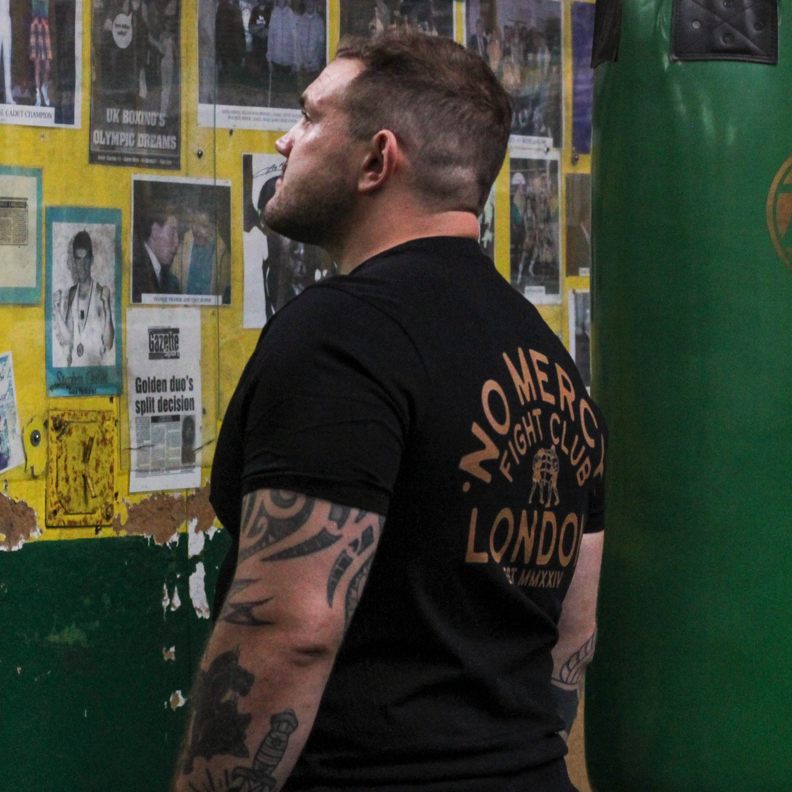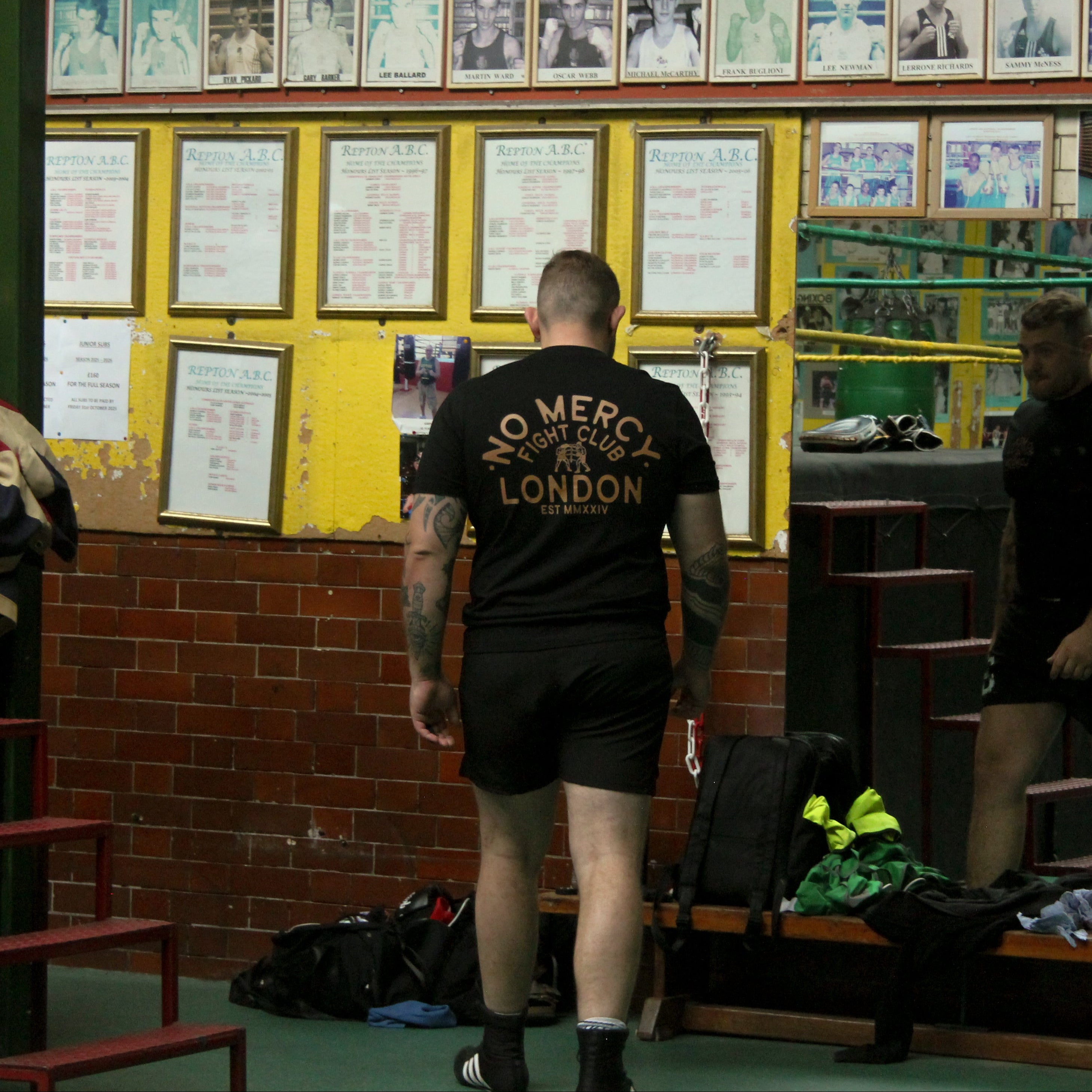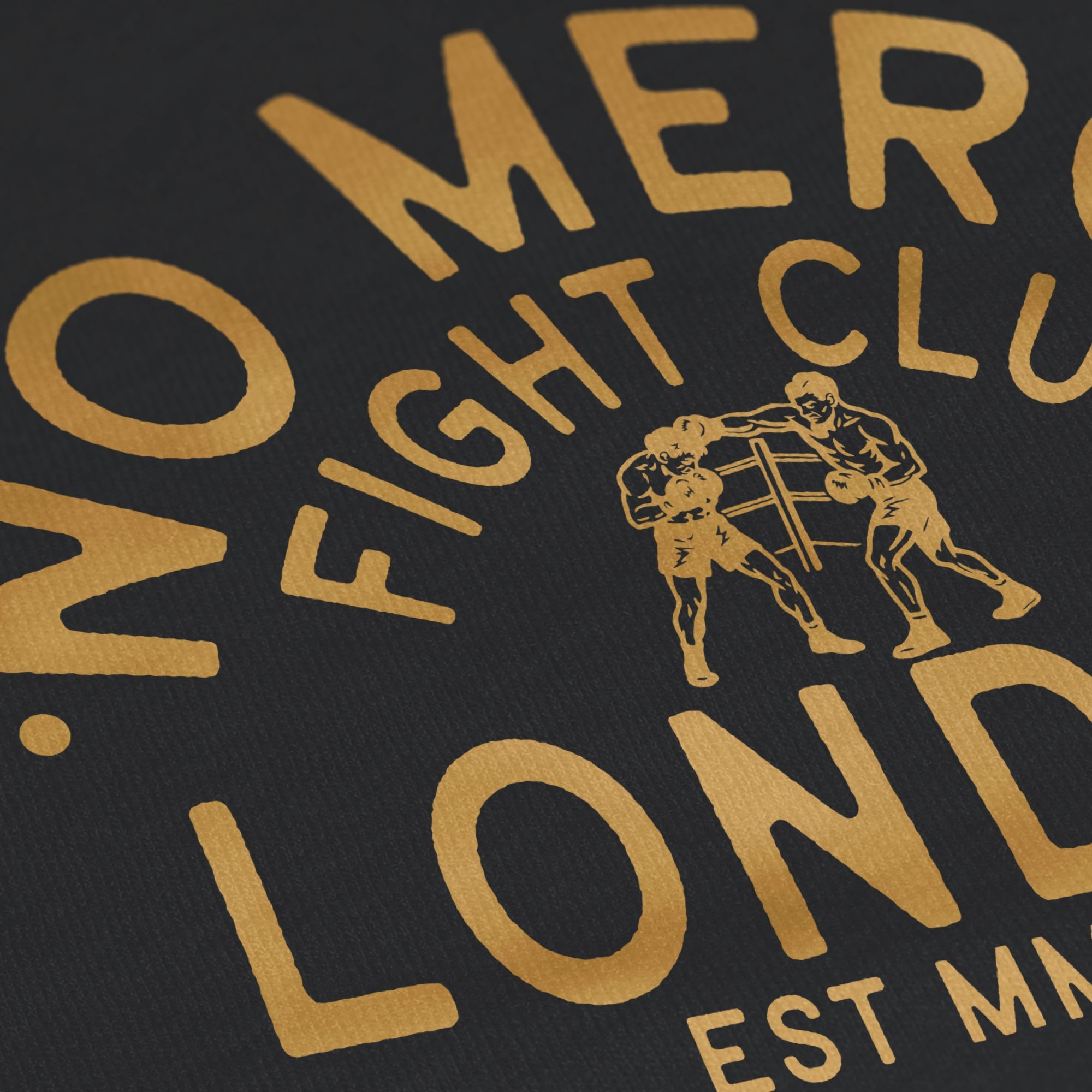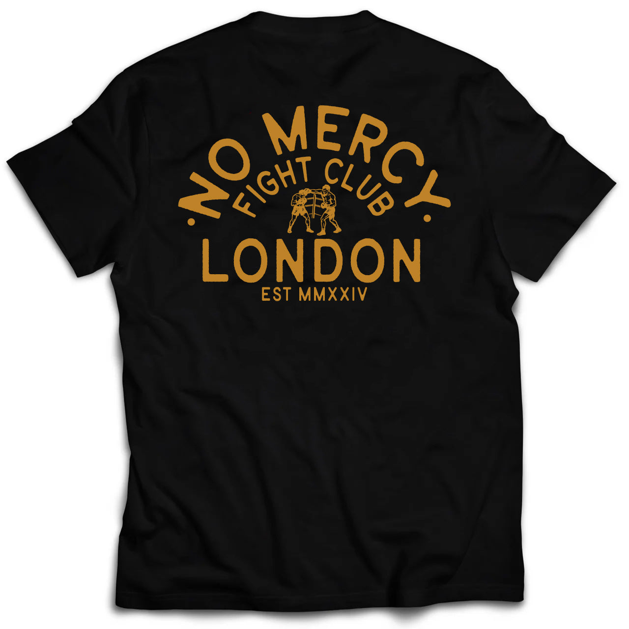 • Back Graphic: “No Mercy Fight Club – London Set MMXXIV” with Boxer Illustration in Yellow