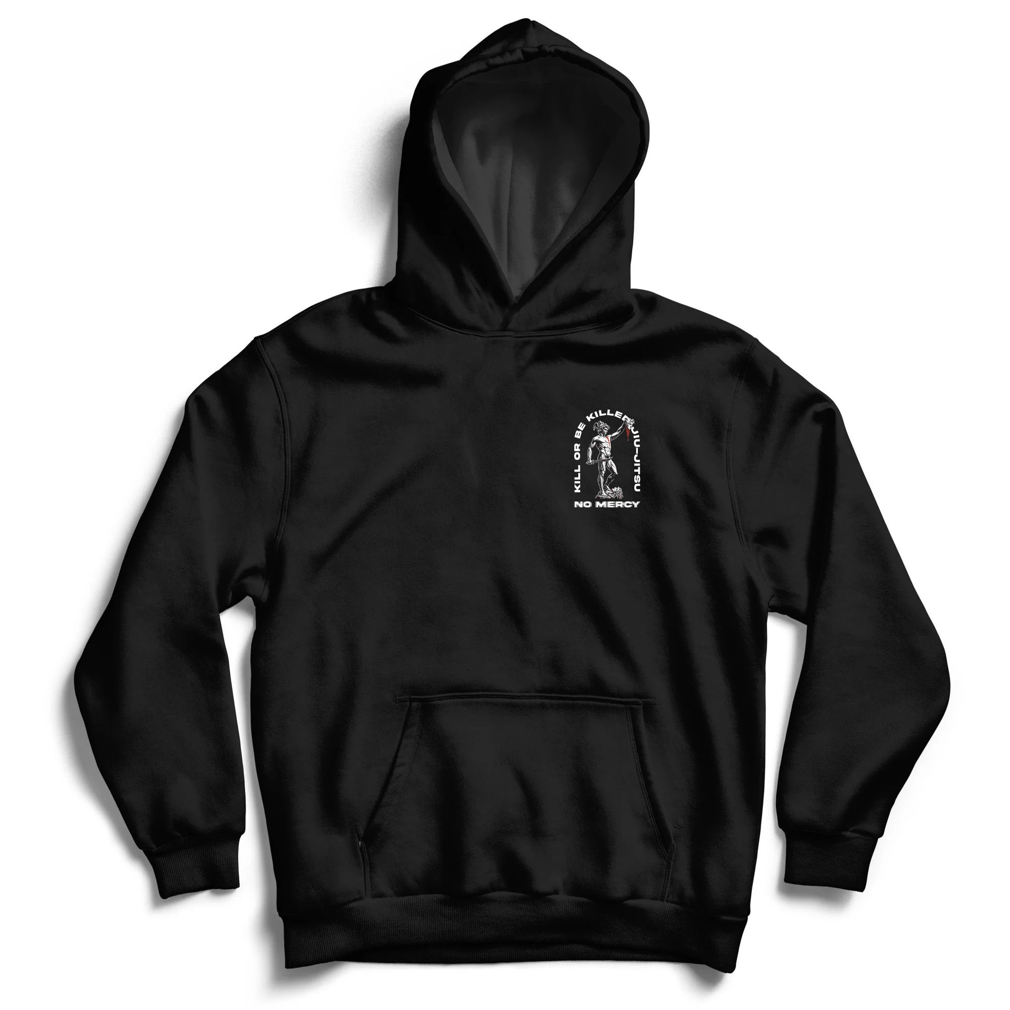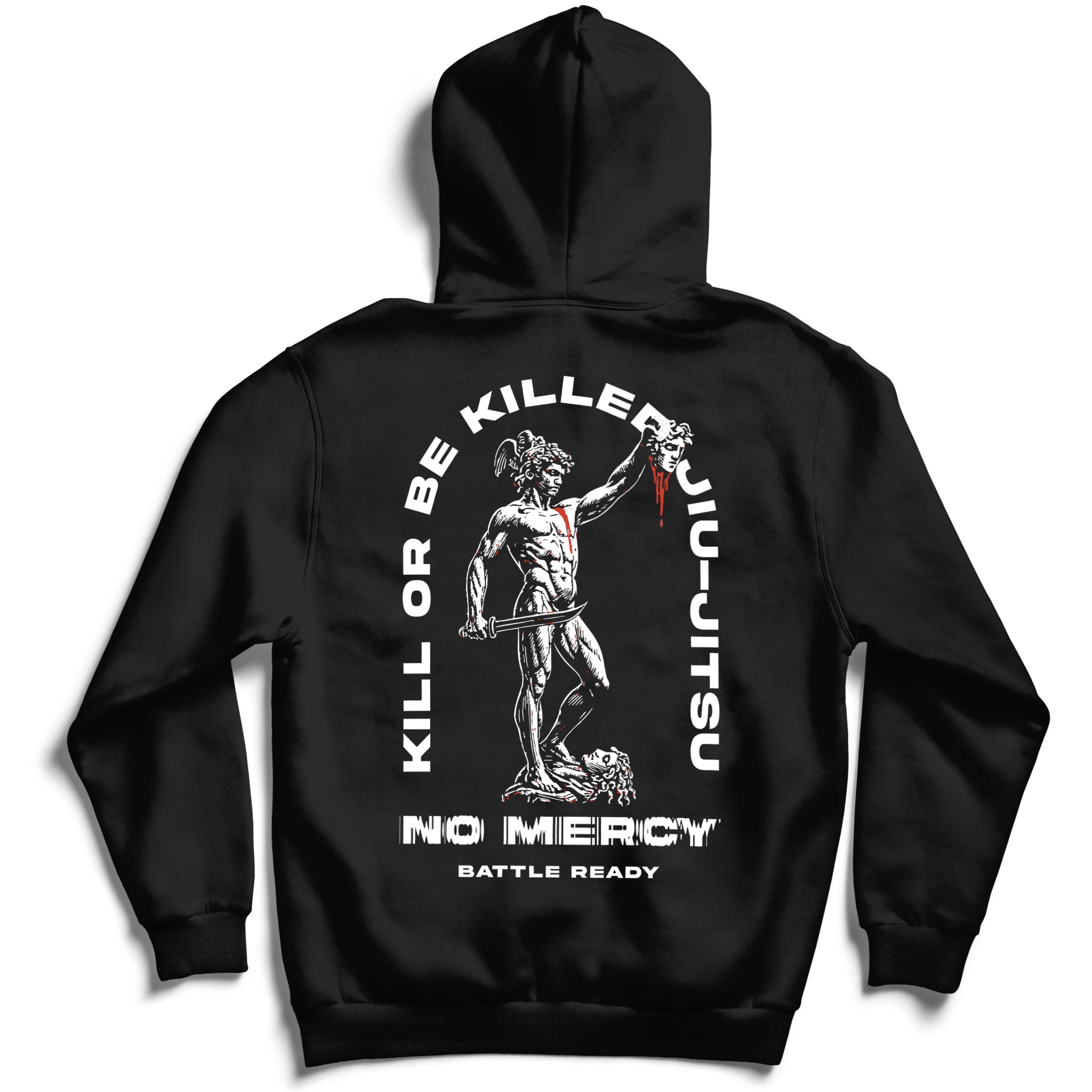 On the back, the bold declaration “Kill or Be Killed” frames the artwork, with No Mercy and Battle Ready stamped below — a statement of intent for life, both on and off the mats. The front keeps it clean with a smaller Perseus chest graphic, making it versatile enough for the street, the gym, or the walkout.
