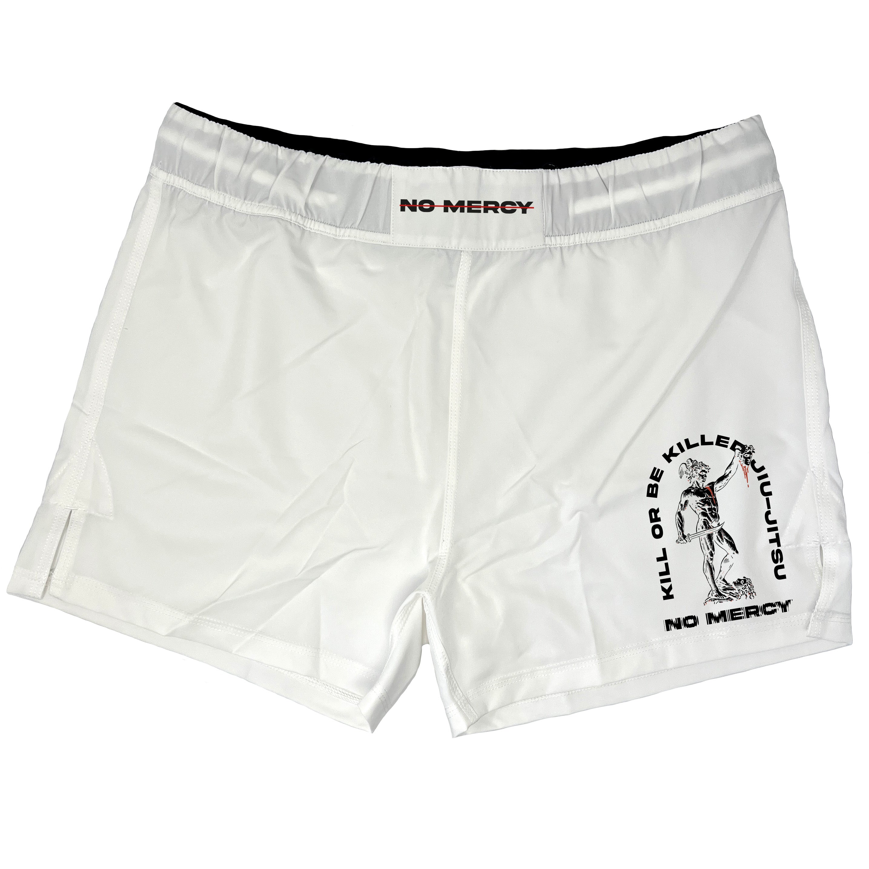 Across the waistband, the bold “No Mercy” statement seals the intent: these shorts are made for battle, not for comfort. Minimal in palette but heavy in meaning, the white base with black print delivers a striking presence on and off the mats.