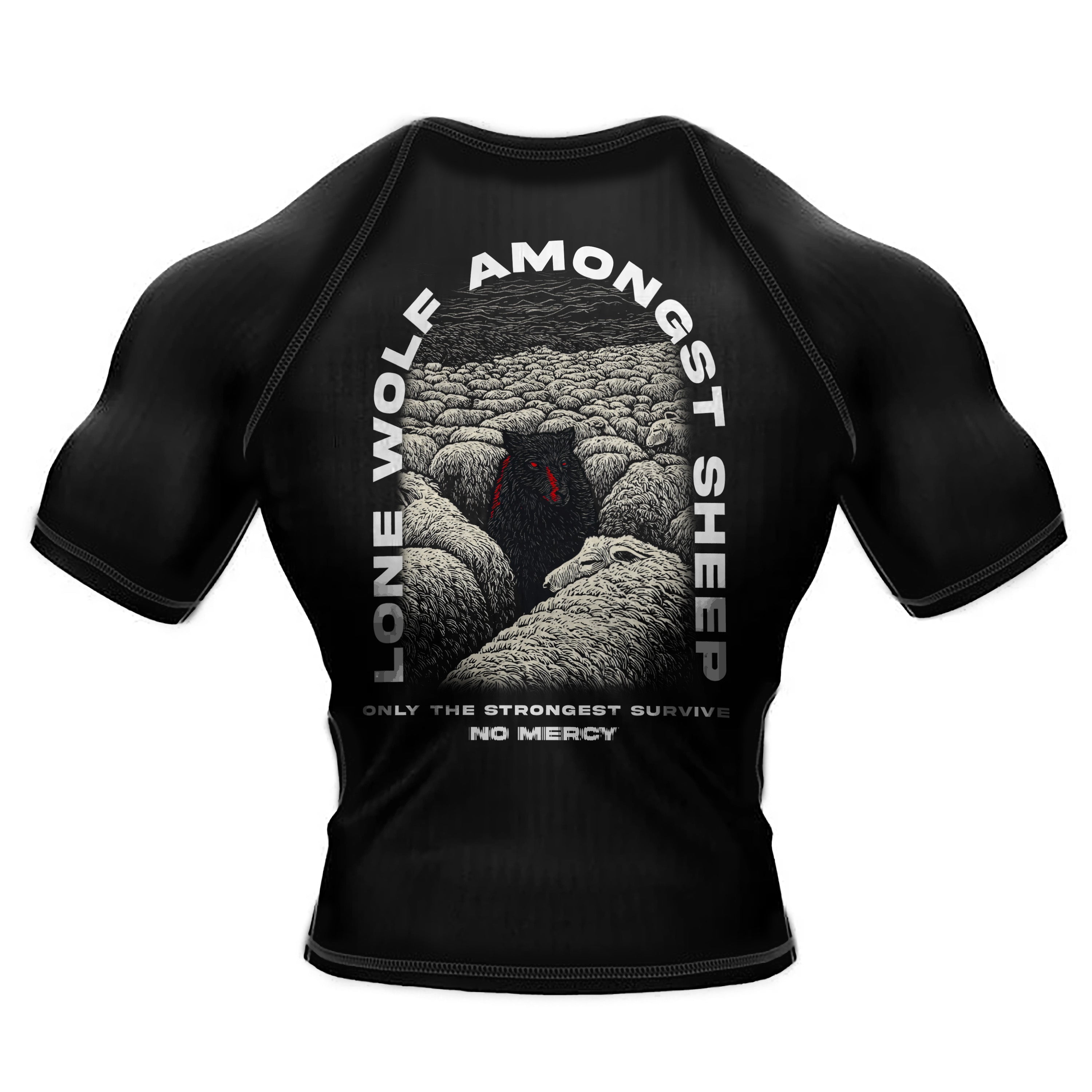 Step onto the mats with the mentality of the outlier — the one who stands alone, yet stronger for it. The No Mercy Lone Wolf Rash Guard embodies ferocity, survival, and the refusal to blend in. On the back, the declaration “Lone Wolf Amongst Sheep” surrounds a savage wolf standing amongst sheep, blood-stained and unyielding. Beneath it, the creed “Only the Strongest Survive” and the unrelenting No Mercy seal the intent.