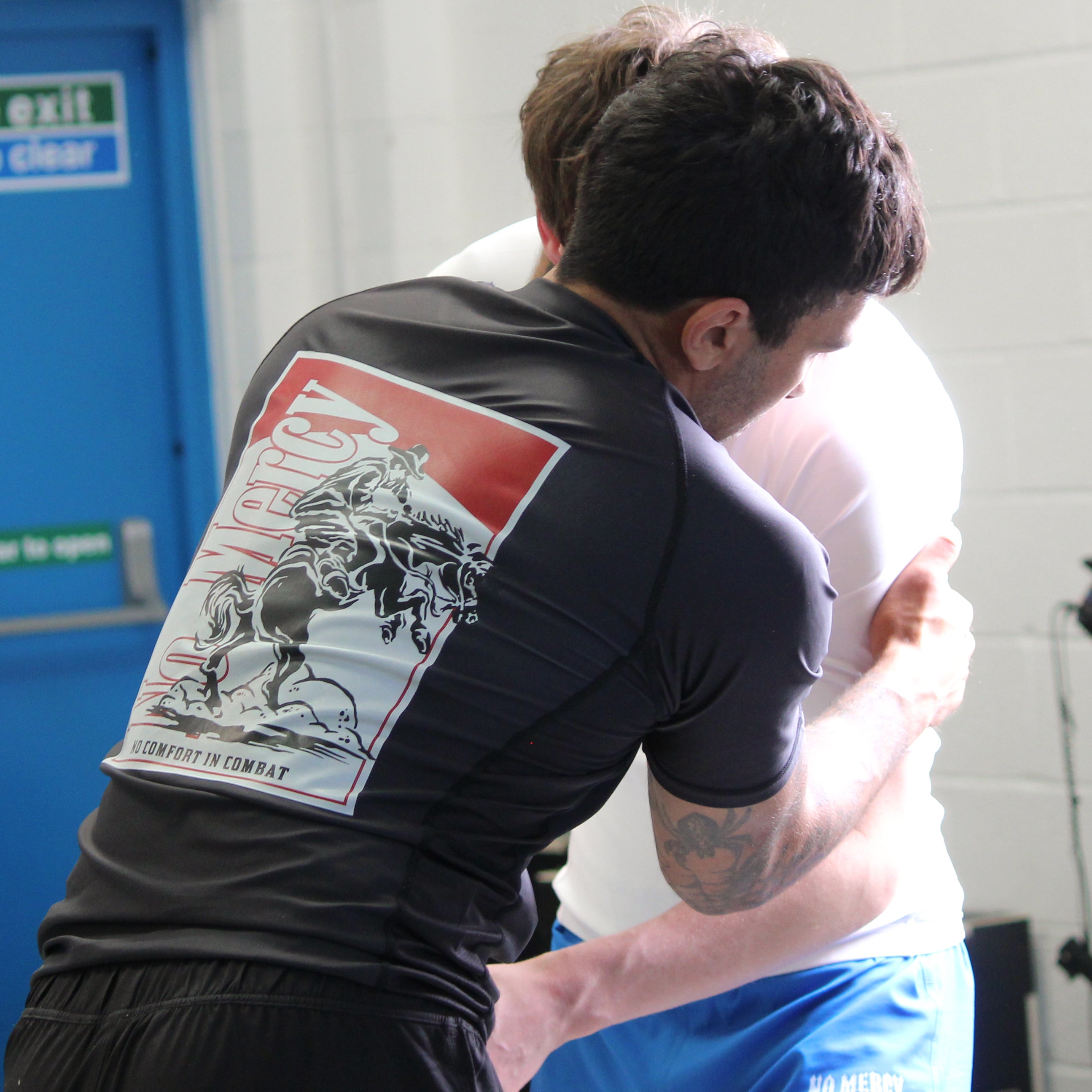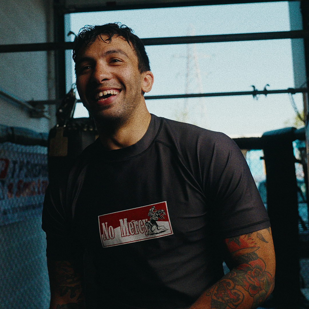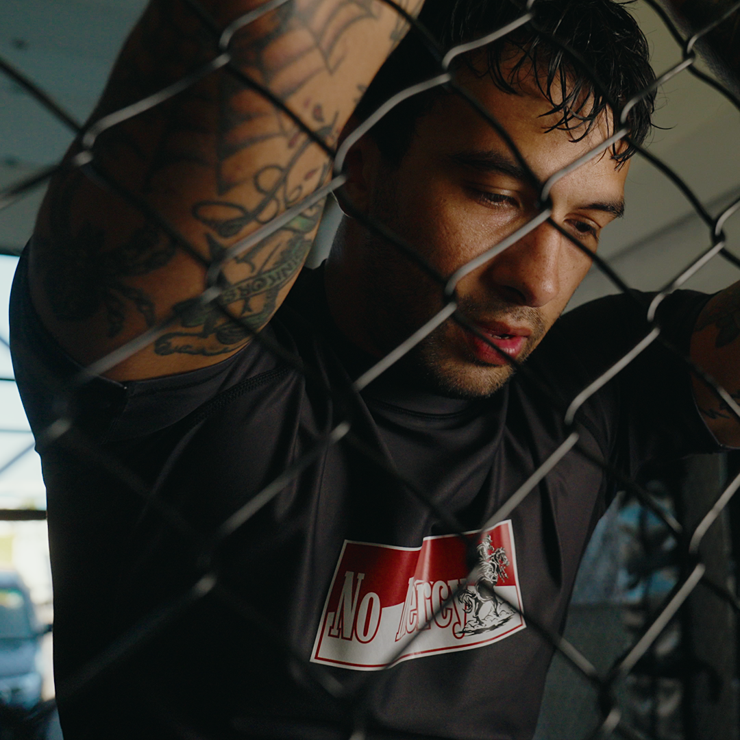The No Mercy “No Comfort in Combat” Rash Guard rides straight out of the wild — blending American frontier grit with a clean, combat-ready edge. Set against a black base, the back features a striking red-bordered graphic of a bucking horse and cowboy — a nod to Marlboro iconography reimagined for the mat. Framed above: No Mercy. No Comfort In Combat. A battle cry for those who embrace pressure, pain, and the purpose behind every roll.