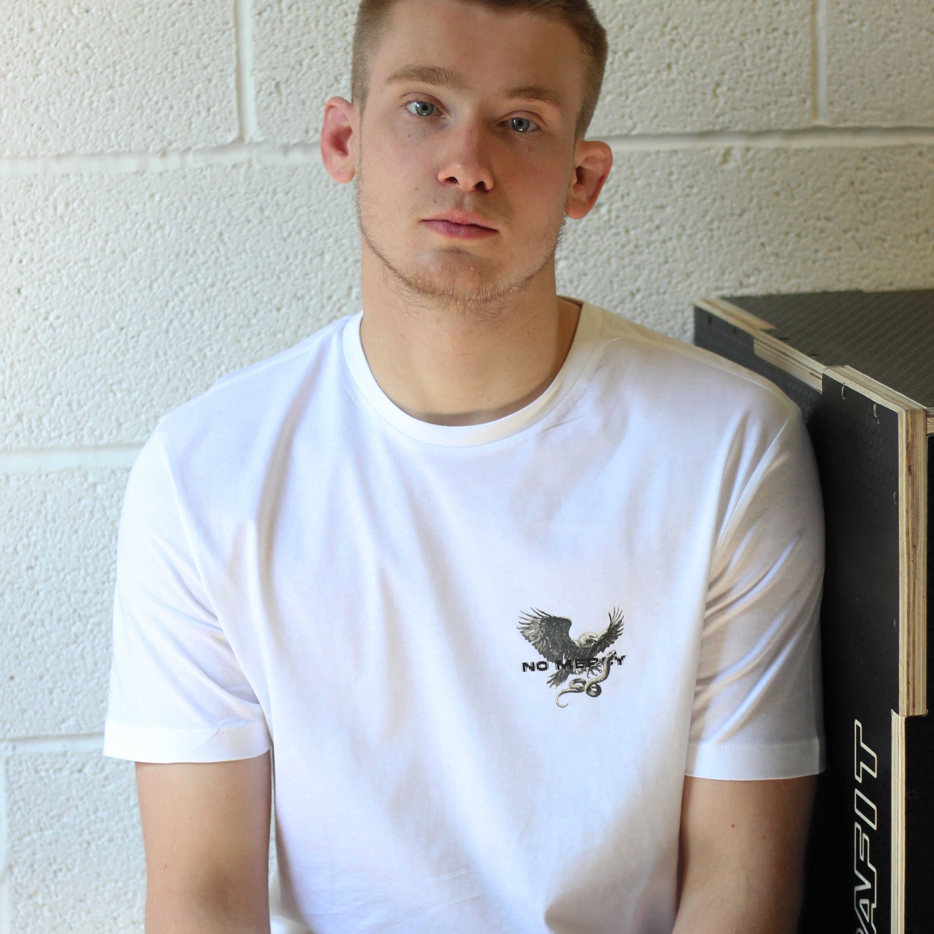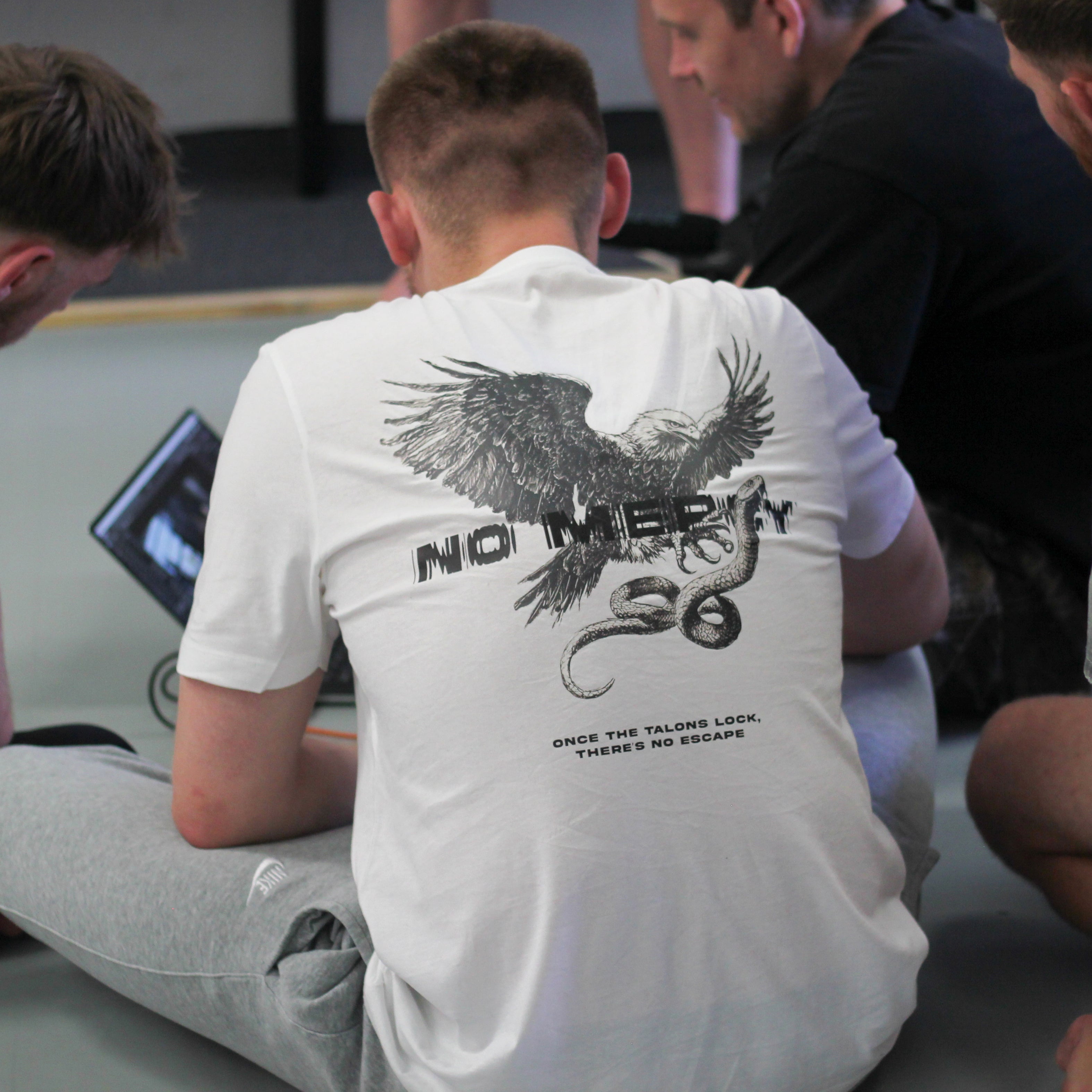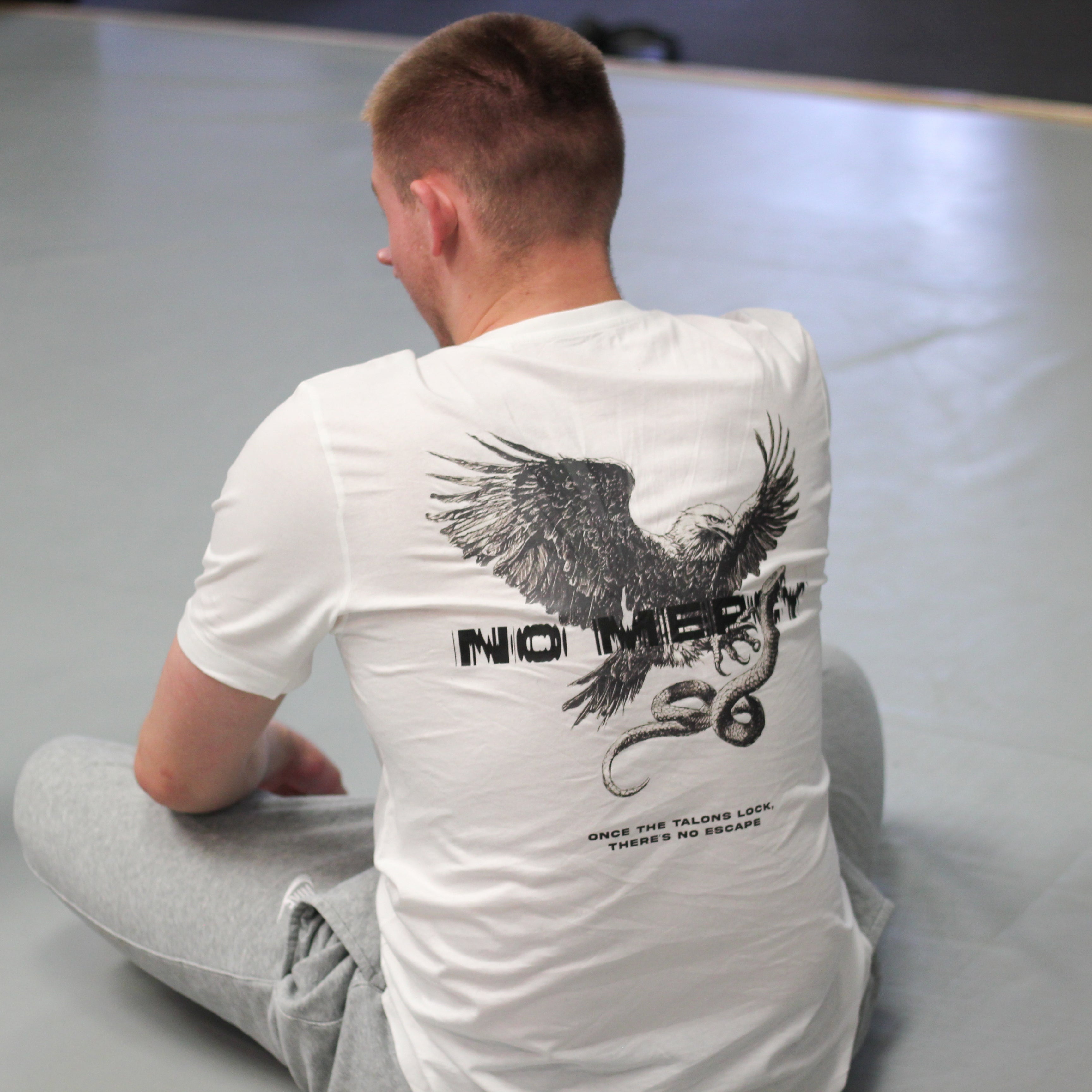 Crafted from heavyweight premium cotton, this white tee offers a structured yet ultra-soft feel, built for comfort both on and off the mats. Designed with a relaxed fit and a ribbed crew neck, it's a statement piece for those who refuse to be prey.