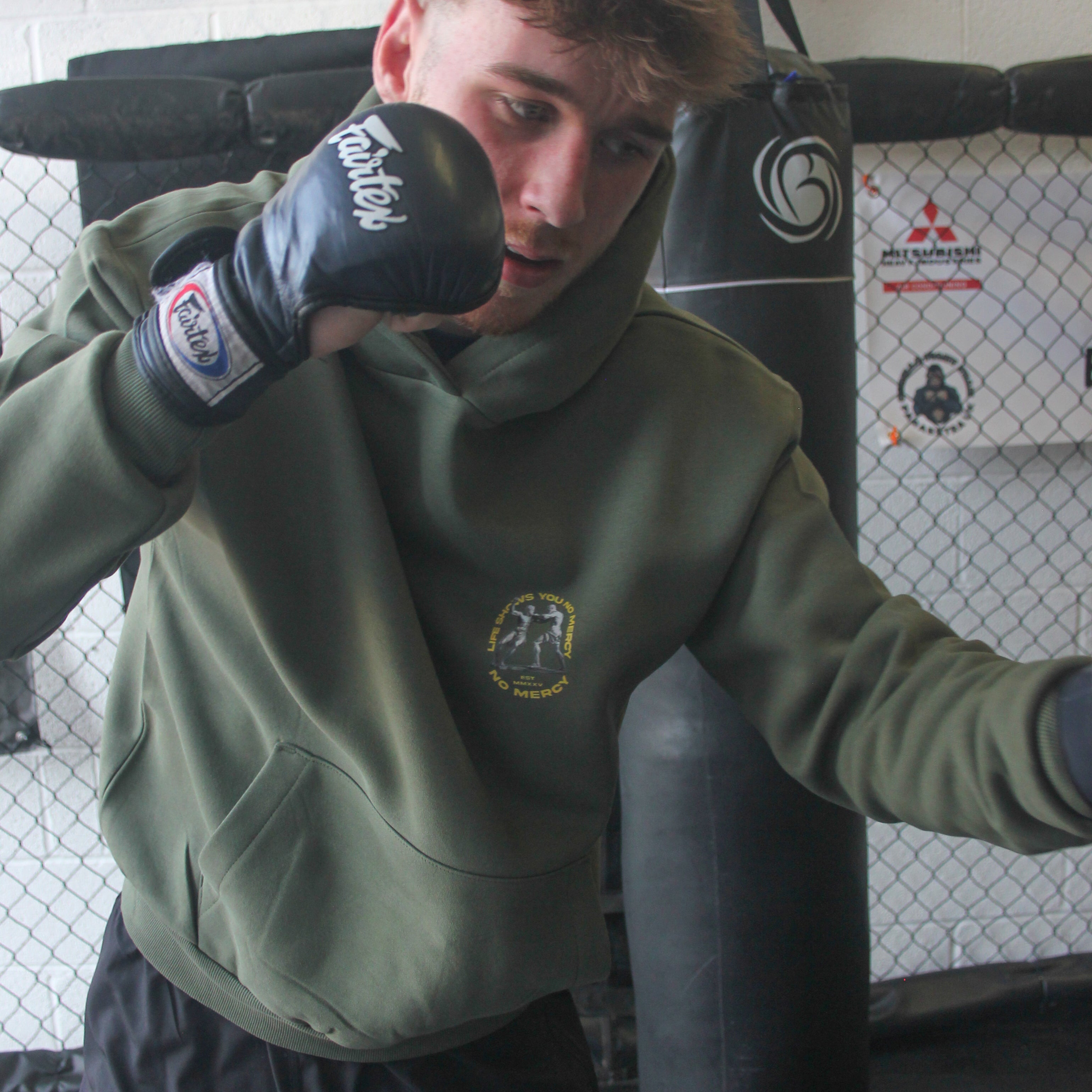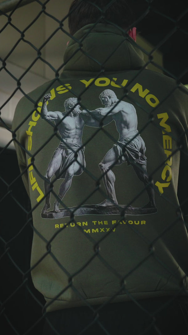 Introducing the Return the favour Hoodie in Khaki, crafted from heavyweight premium cotton for a structured yet ultra-soft feel. This hoodie features a ribbed hem and cuffs for ultimate comfort. The back showcases a bold Life Shows You No Mercy graphic.