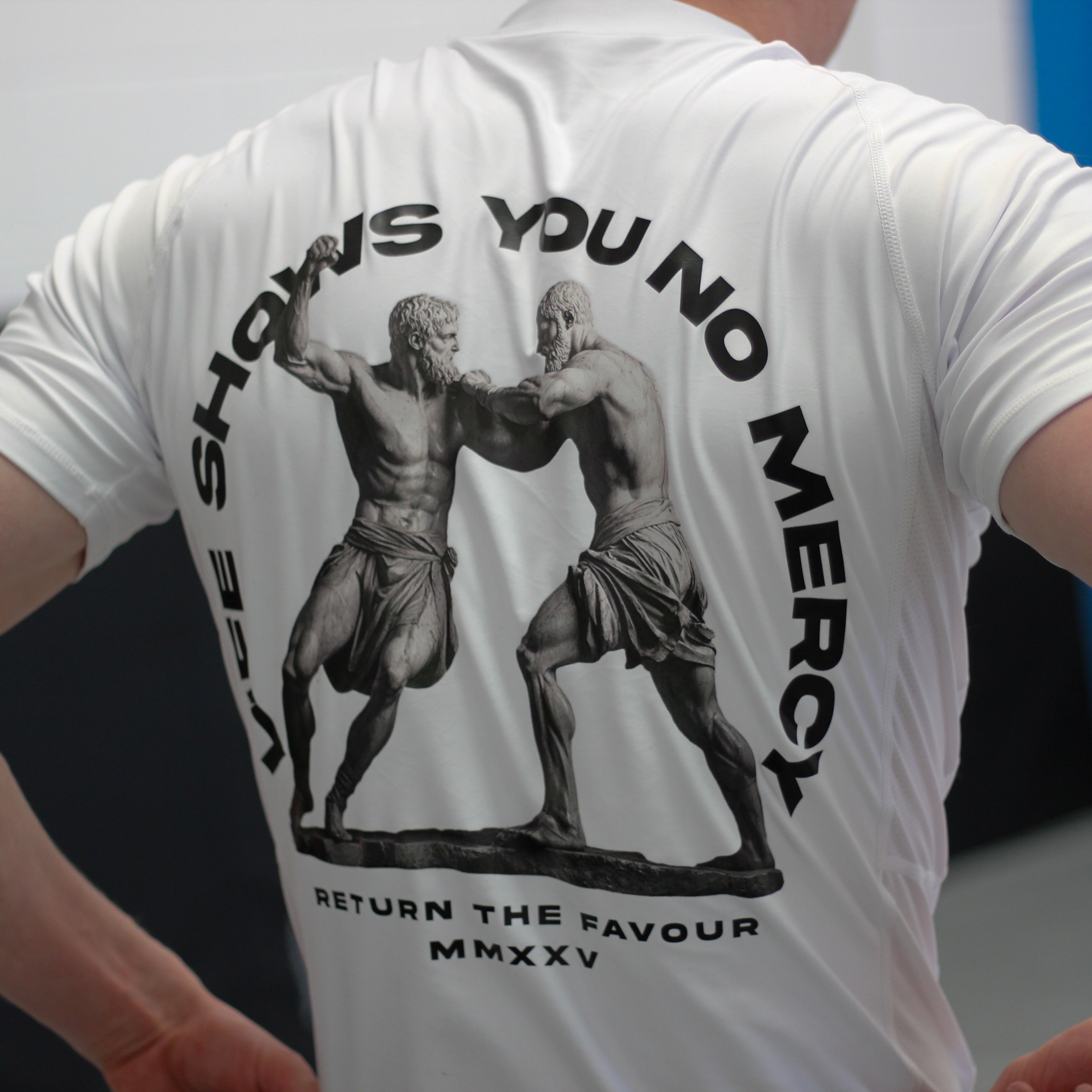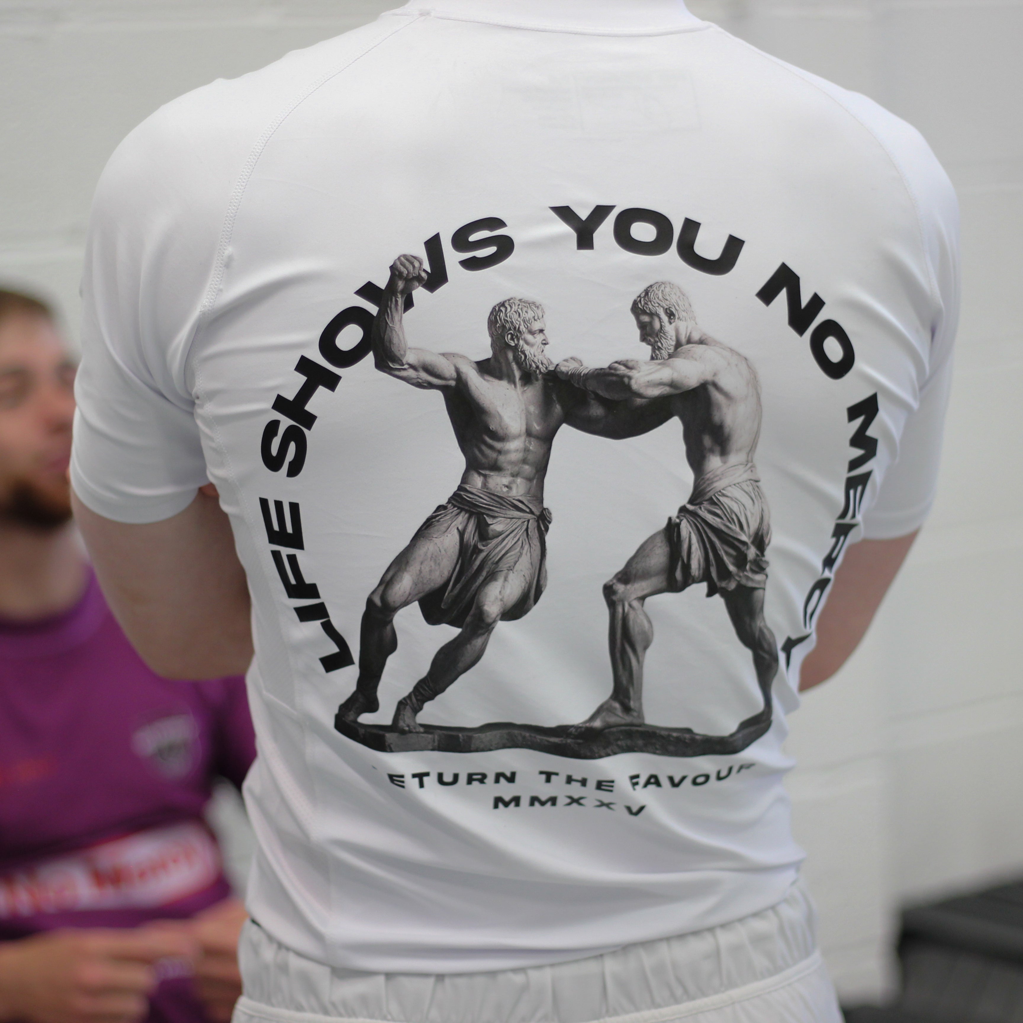 Introducing the No Mercy Jiu-Jitsu Rash Guard in White, crafted for those who fight with relentless intensity. Made from high-performance, moisture-wicking compression fabric, this rash guard delivers superior breathability, flexibility, and muscle support, keeping you locked in during every roll. The design features an intricate Roman statue-style depiction of warriors in battle, printed on both the front and back, symbolizing resilience and the warrior spirit. The powerful phrase “Life Shows You No Mercy, Return the Favour” is incorporated into the design, serving as a constant reminder to fight back against adversity. Engineered for durability and performance, this rash guard offers a second-skin fit, reinforced stitching, and sublimated graphics that will never fade, crack, or peel—built for those who train with No Mercy.