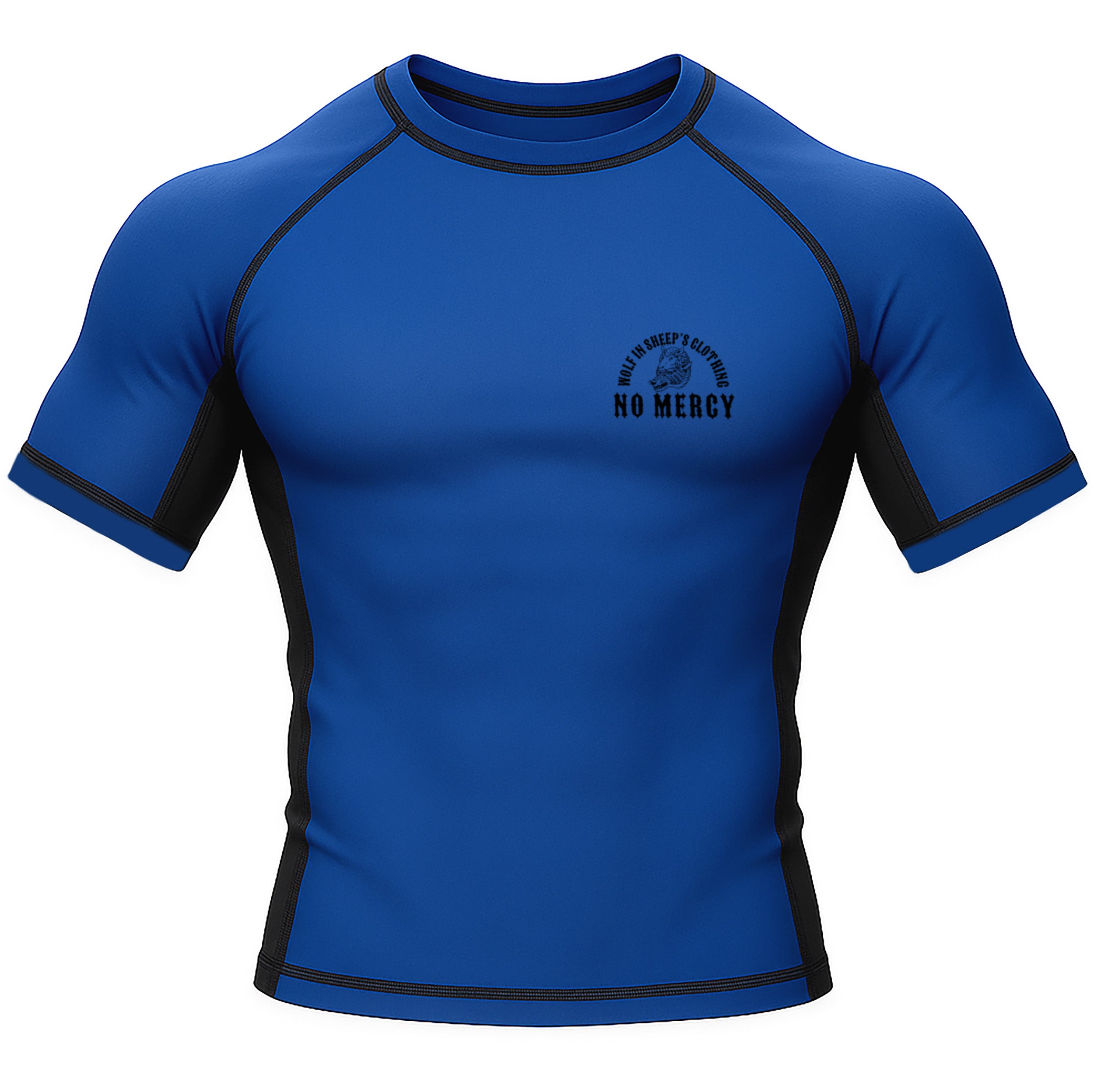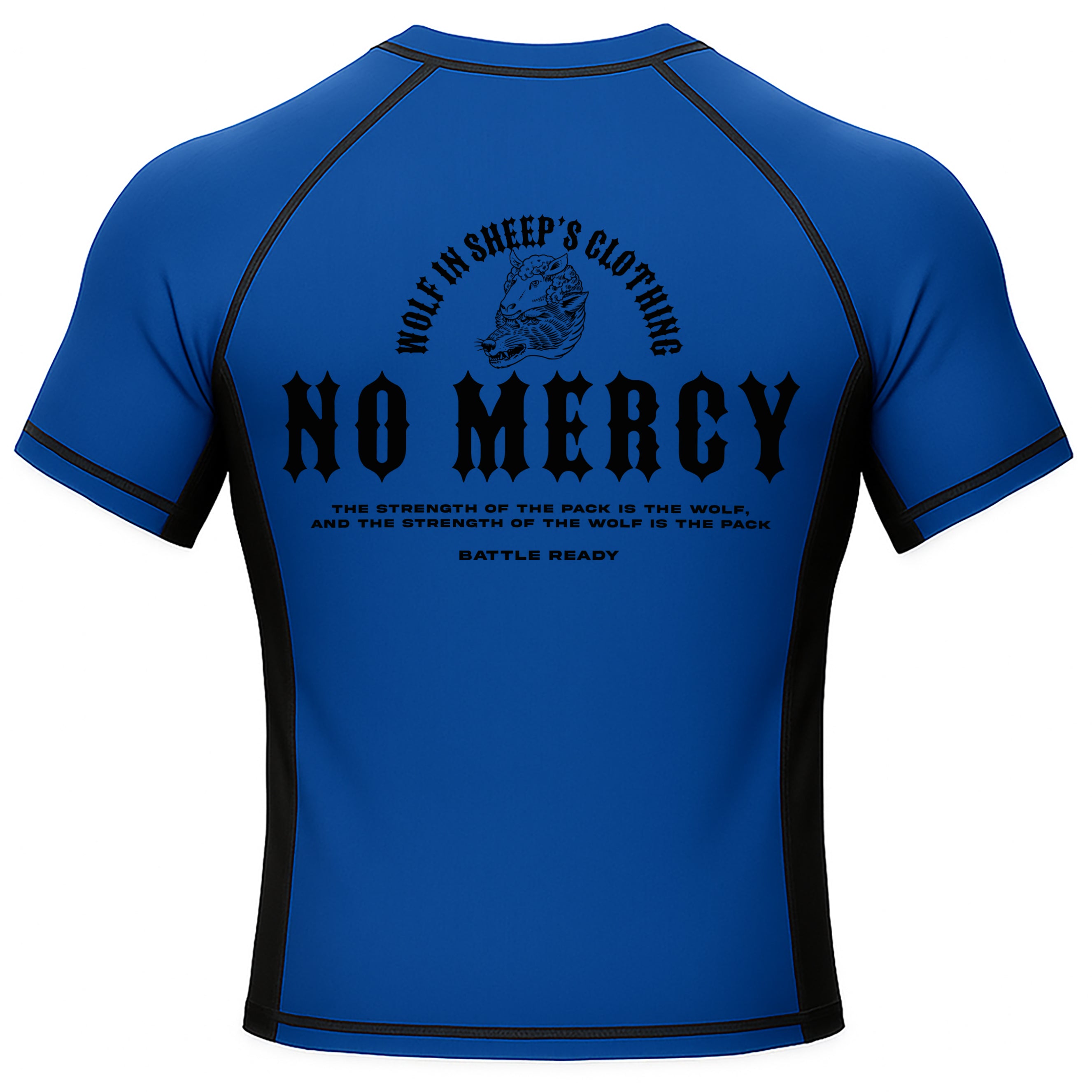 Step onto the mats with deception and dominance in your arsenal. The No Mercy Blue Rash Guard – Wolf in Sheep’s Clothing Edition embodies cunning, strength, and the will to strike when it matters most. Featuring a wolf wearing a sheep’s mask, this design symbolizes hidden ferocity — the predator disguised until the moment of attack.