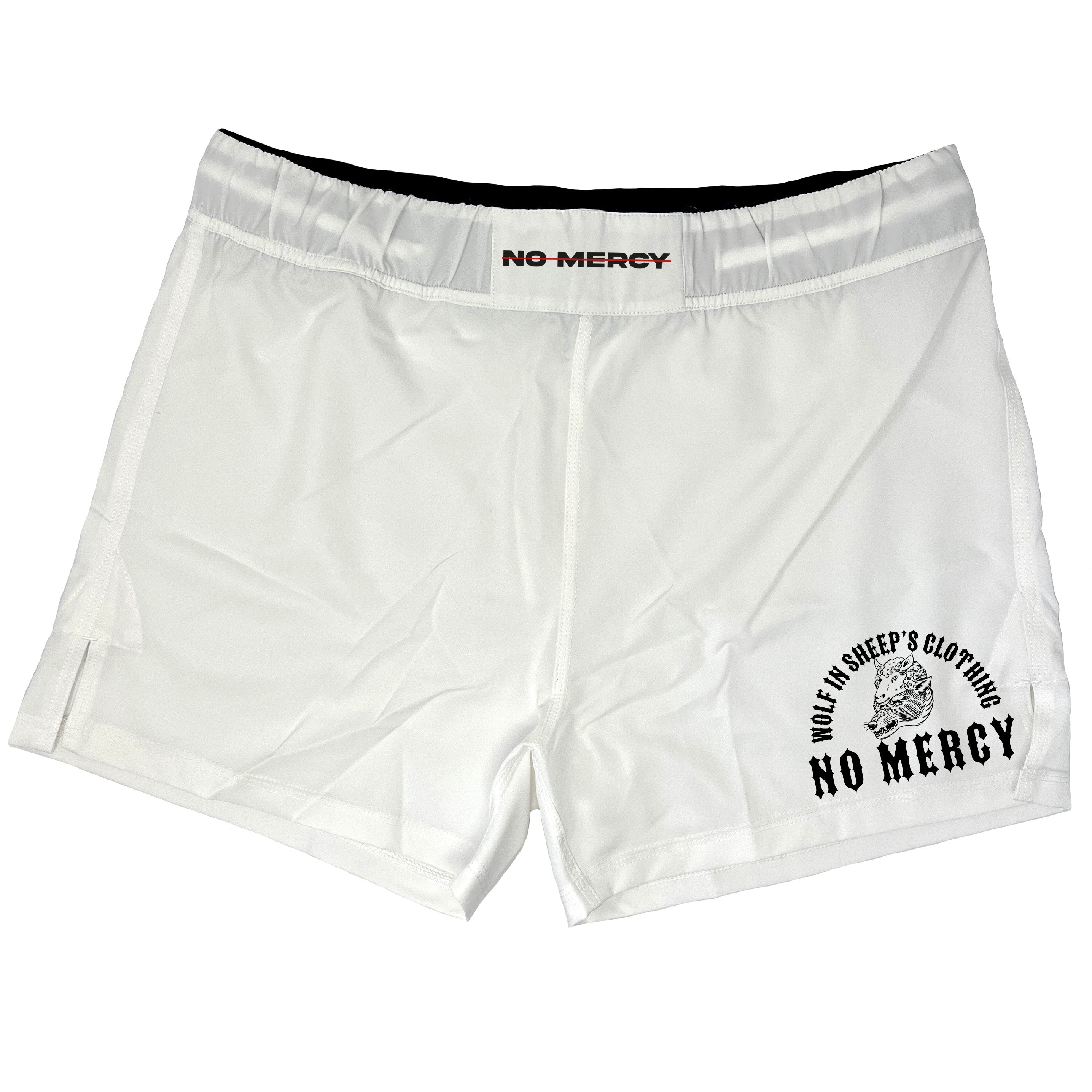 Step onto the mats with cunning and ferocity hidden in plain sight. The No Mercy Wolf in Sheep’s Clothing Shorts are built for fighters who strike when it matters most. Featuring the bold “Wolf in Sheep’s Clothing” statement above the artwork on the left thigh, anchored with the No Mercy logo beneath, this design embodies deception, resilience, and the will to dominate.